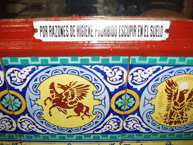 El lugar es una rareza con su hermoso tirador de la puerta, sus bancos y mesas, más esos letreros que avisan de la prohibición de escupir.
